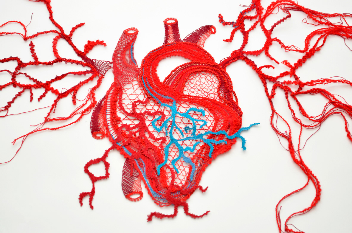 Heart, in move, made of bobbin lace. Lace in different layers. Piece made with linen, silk, cotton and wool yarn. This piece is a tribute to the poem by Mario Benedetti ("breastplate heart"= corazón coraza)