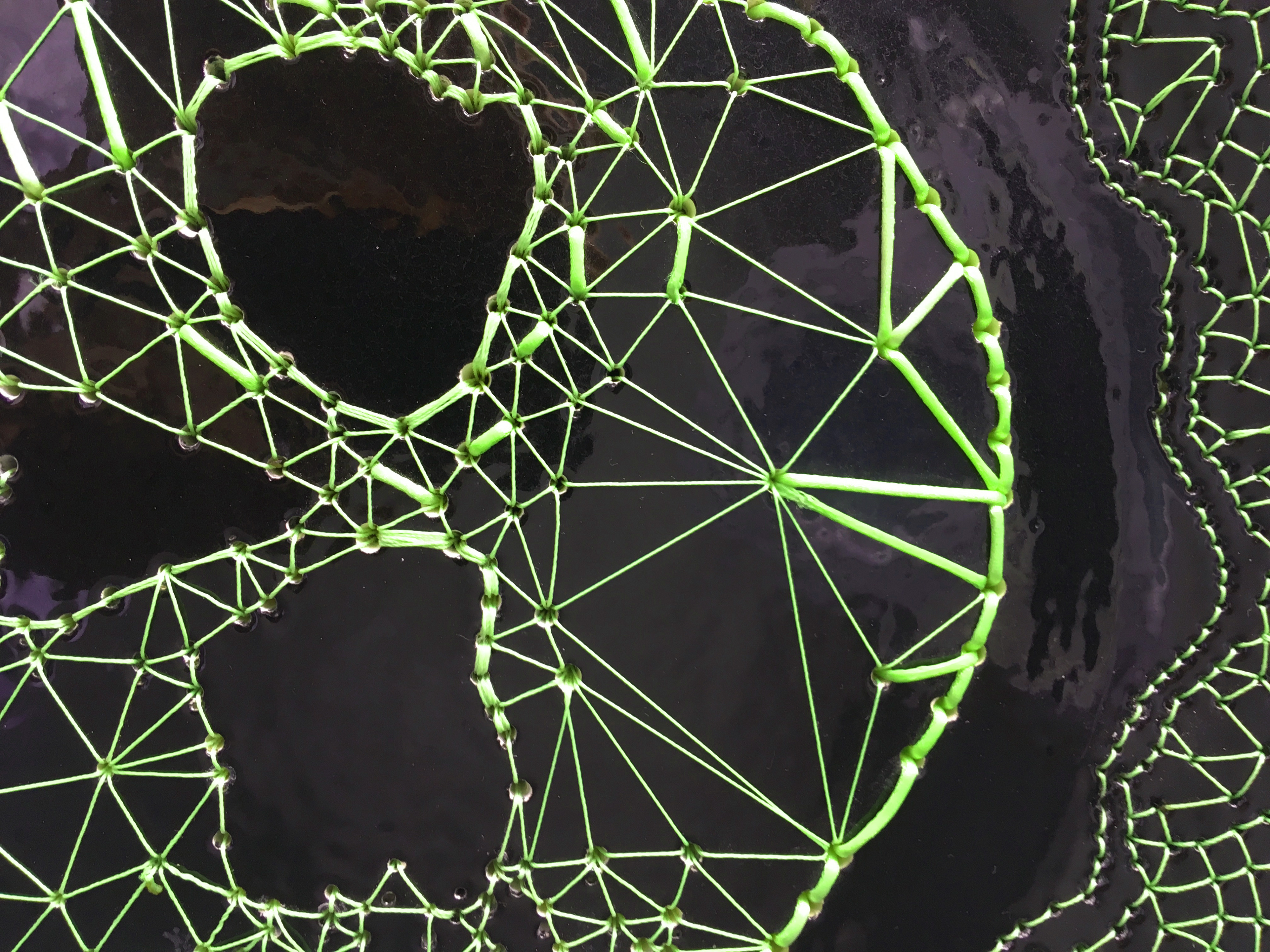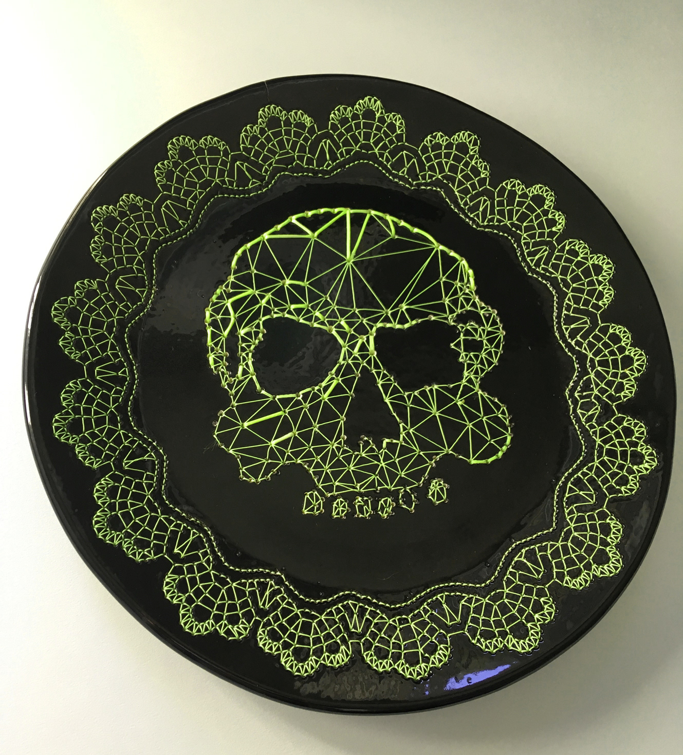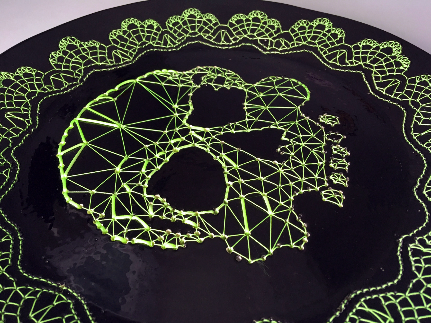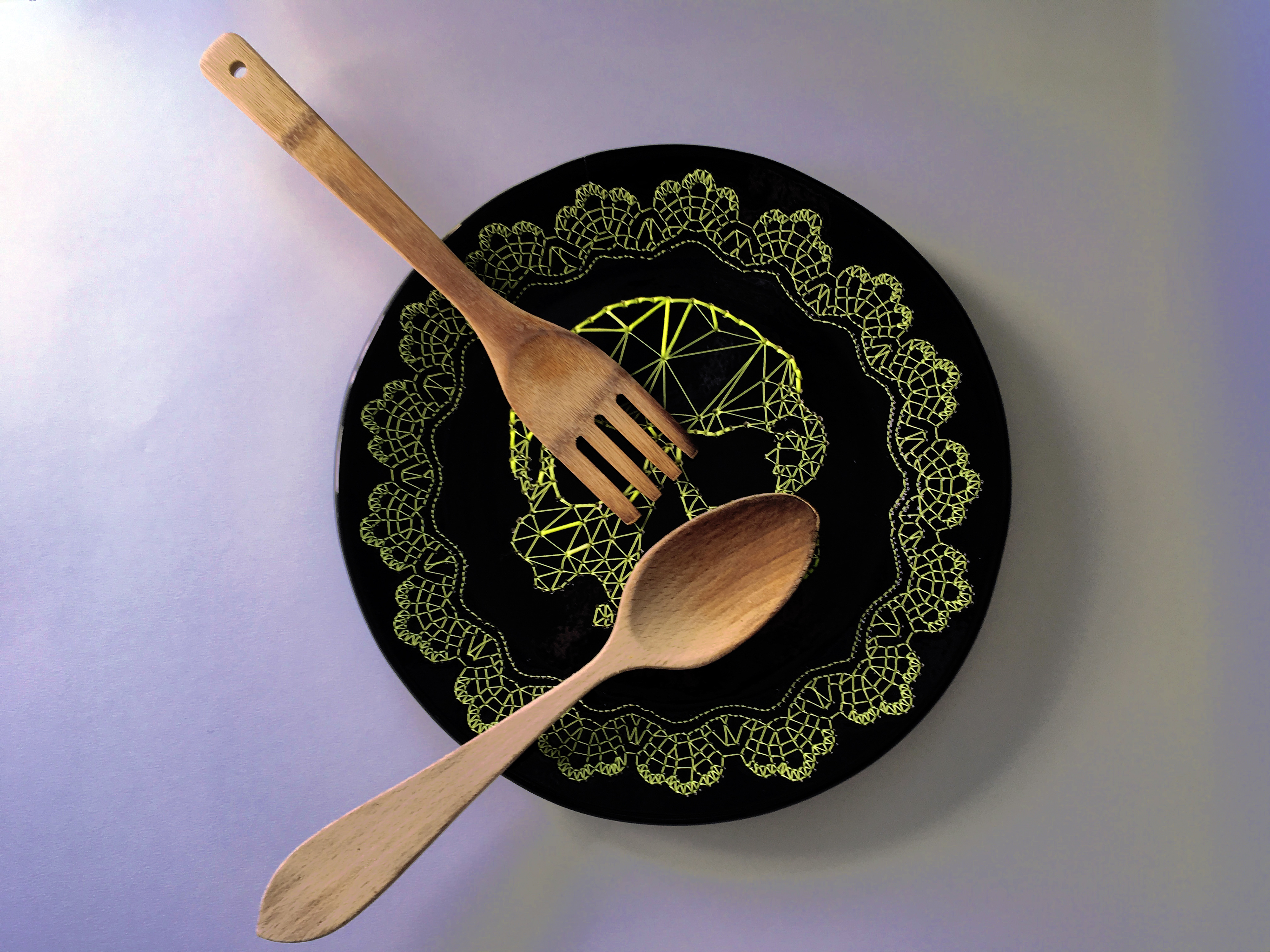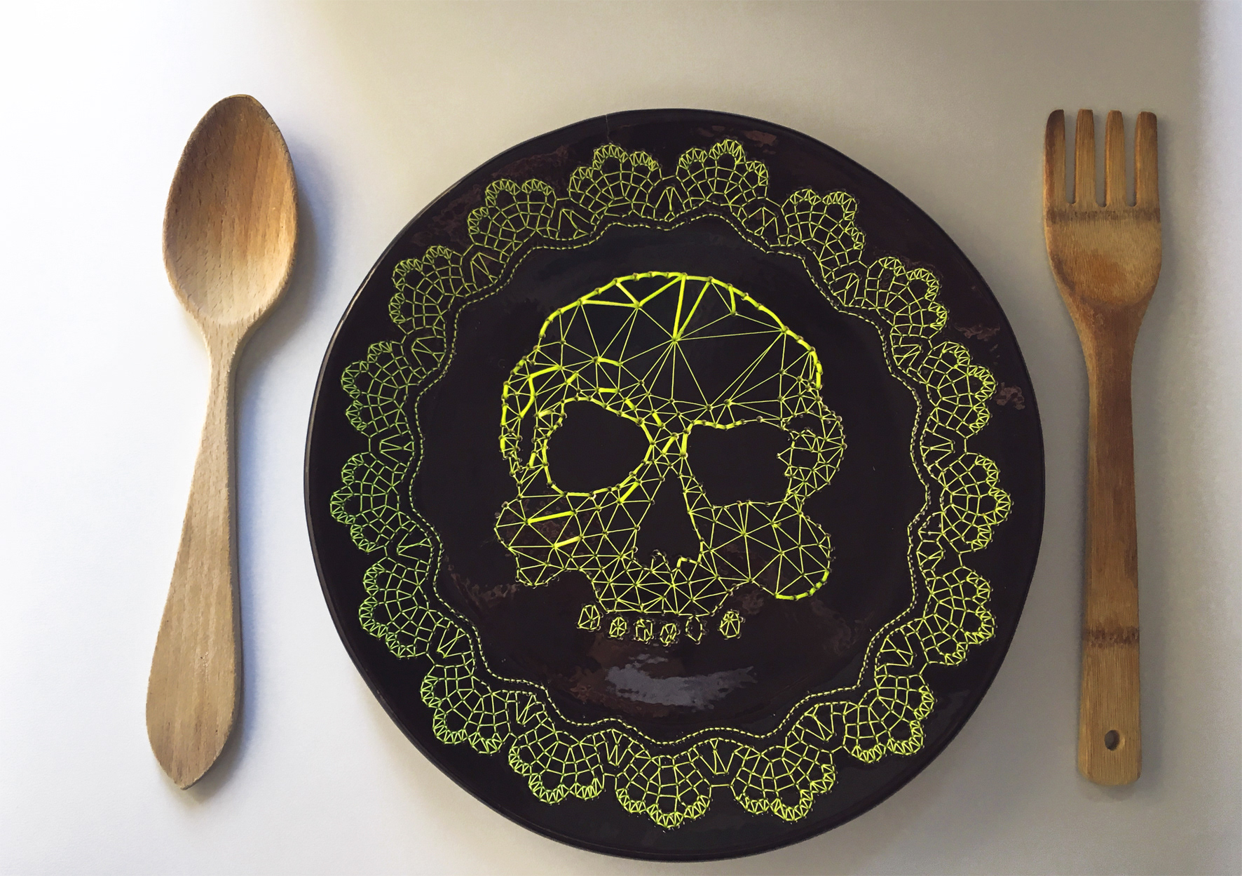Eat your ego, (second part) is an embroidered ceramic plate. the embroidery is on the edge of the plate is a lace (embroidered) and in the center a skull (embroidered), the embroidery is made with fluorescent nylon and rayon threads, which represents the main menu: "your ego" and how it goes Stay your ego after you have eaten. "Your ego" is always on the plate, served for you to eat it. This is a collaboration with the ceramist Miguel Vazquez.